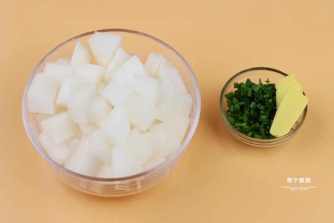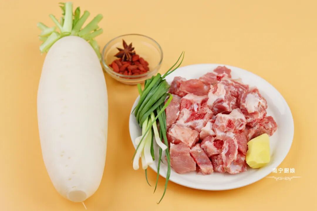 准备食材:萝卜1个,排骨500克,青葱50克,生姜20克,八角1粒,枸杞10克。