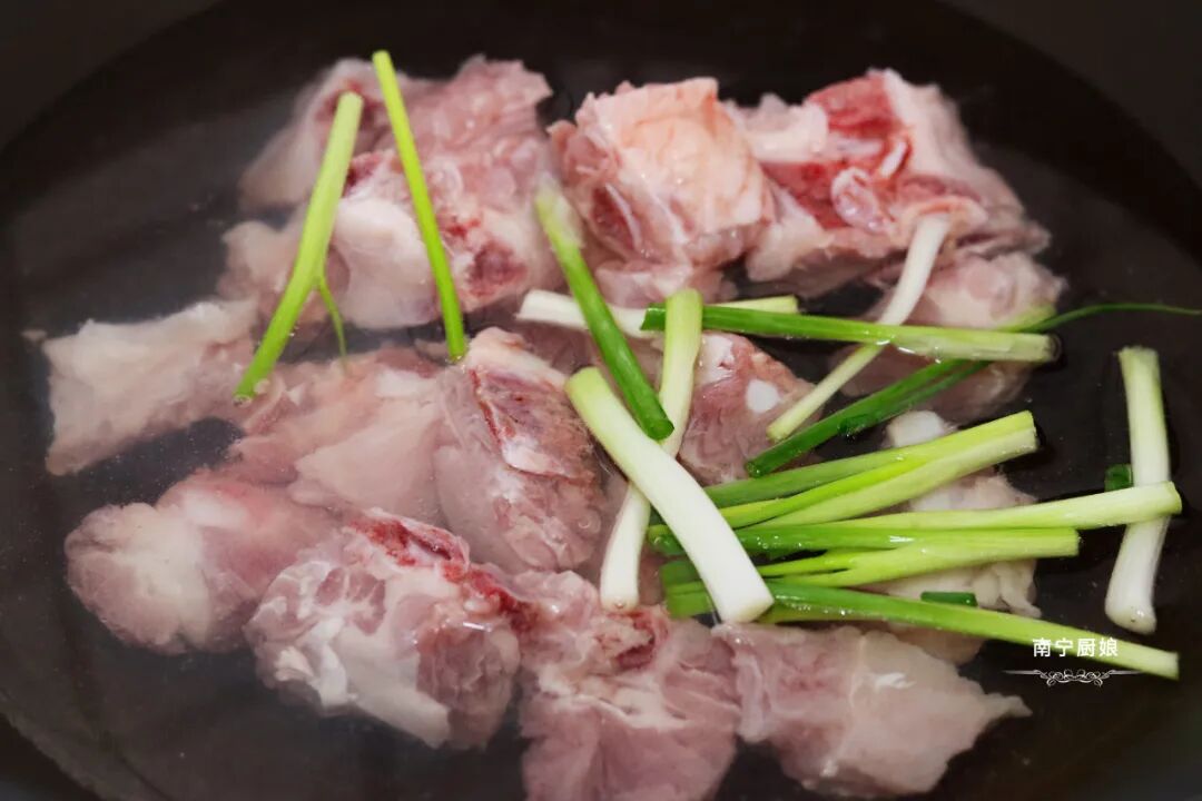 3、起锅,往锅里加入清洗好的排骨,然后加入冷水,再加入部分葱段给排骨去腥增香,冷水起煮,给排骨进行焯水。