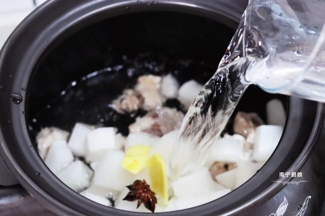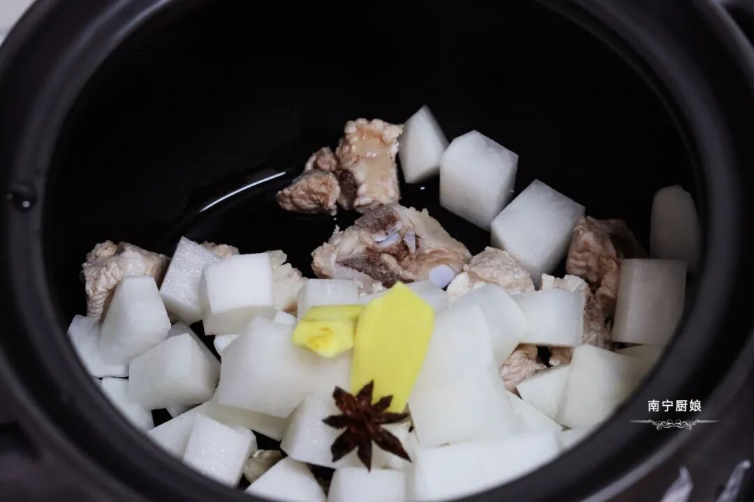 5、接下来把焯好水的排骨,放进砂锅里,再加入切好的萝卜块、生姜片、八角1粒以及足够的清水,盖上盖子,用砂锅炖煮30分钟。