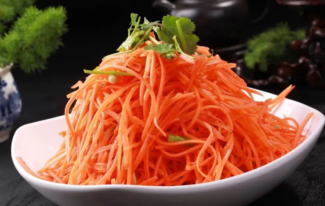胡萝卜切成丝后,用沸水快速焯水,加入盐、醋、香油、橄榄油、白糖、生抽等调料,不仅味道鲜美,还能促进胡萝卜素的转化,防止高温下维生素C的流失,再加上橄榄油的保护,可以全面补充身体营养!
