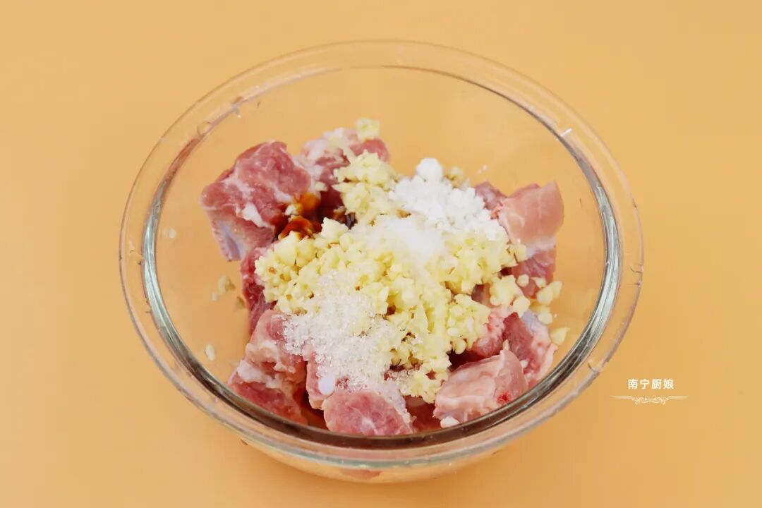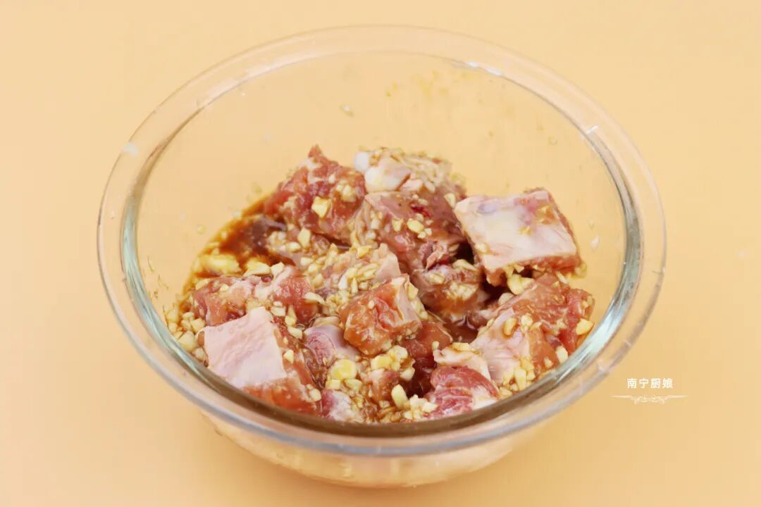 2、排骨提前用温水浸泡30分钟,并且清洗干净,然后加入蒜泥、食盐、淀粉、蚝油、生抽、料酒白糖抓拌均匀,以上的调料用量大家可以根据自己的口味喜好添加哦。