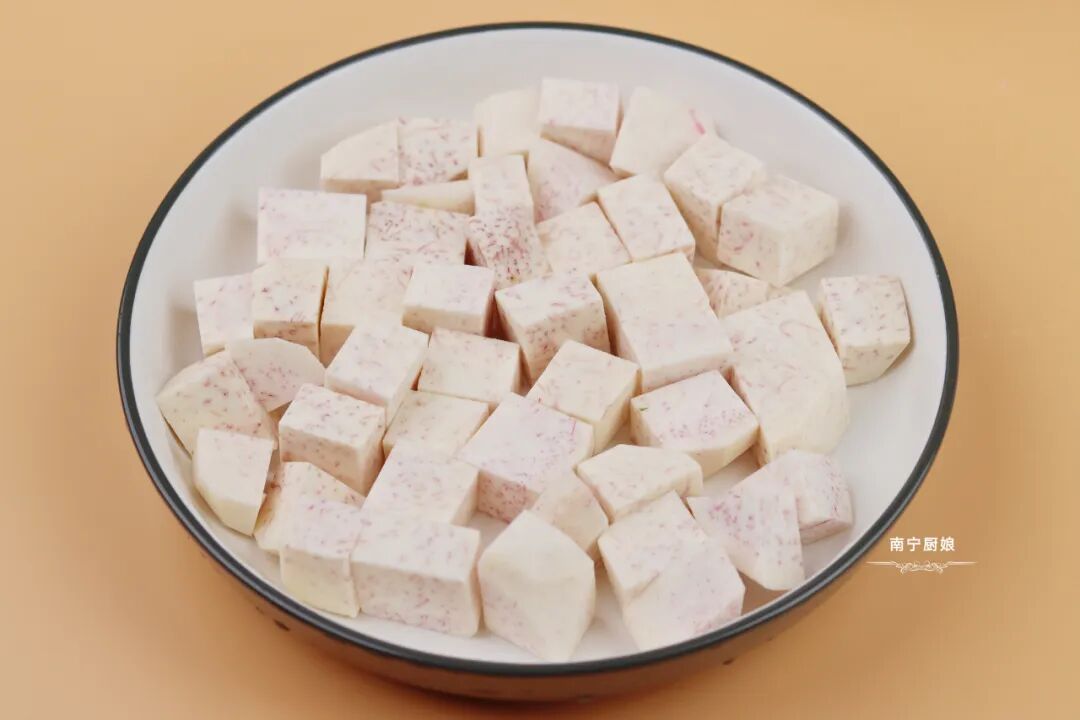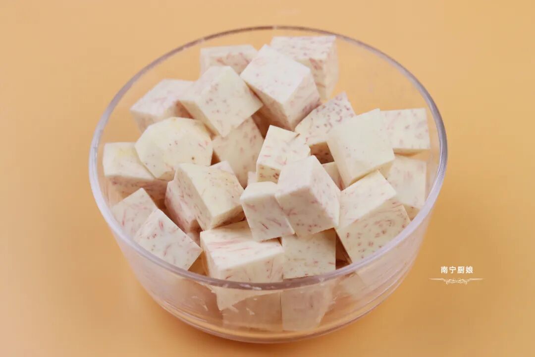 4、荔浦芋头清洗干净,削掉外皮之后,切成正方形的块状。大家在给芋头去皮的时候要注意戴上一次性手套,因为芋头当中的黏液蛋白直接接触到皮肤是很容易引起过敏的,但蒸熟之后就是营养啦,所以在处理食材的时候,也要保护好自己哦。