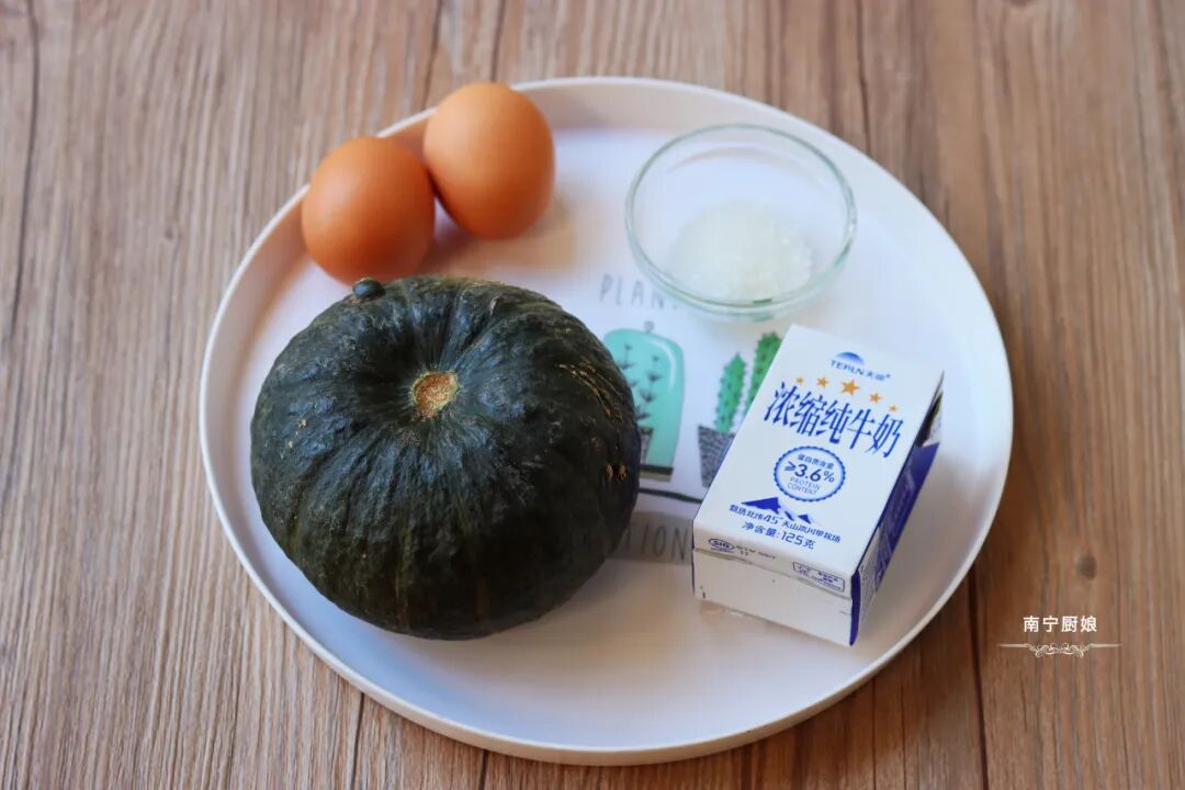 准备食材:贝贝南瓜1个,鸡蛋2个,纯牛奶80毫升,白糖15克。