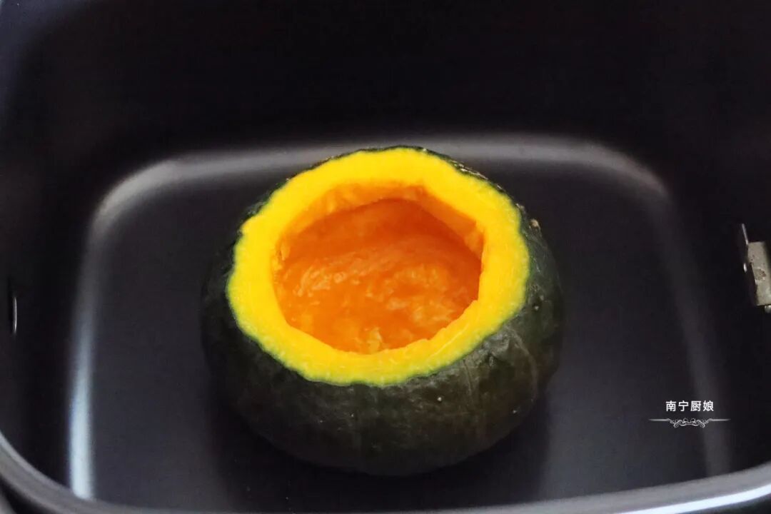 5、倒好之后继续放进空气炸锅里,一样设置180度,再烤25分钟。时间到之后,我们的南瓜烤鸡蛋就做好了。