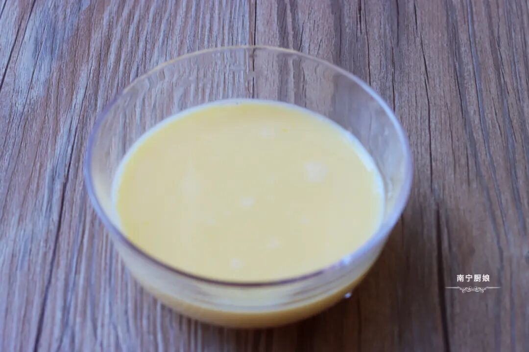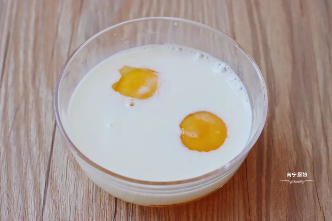 3、鸡蛋打在碗里,然后加入80毫升纯牛奶、15克的白糖,用打蛋器把鸡蛋和牛奶以及白糖搅拌均匀,就可以放在一旁备用。