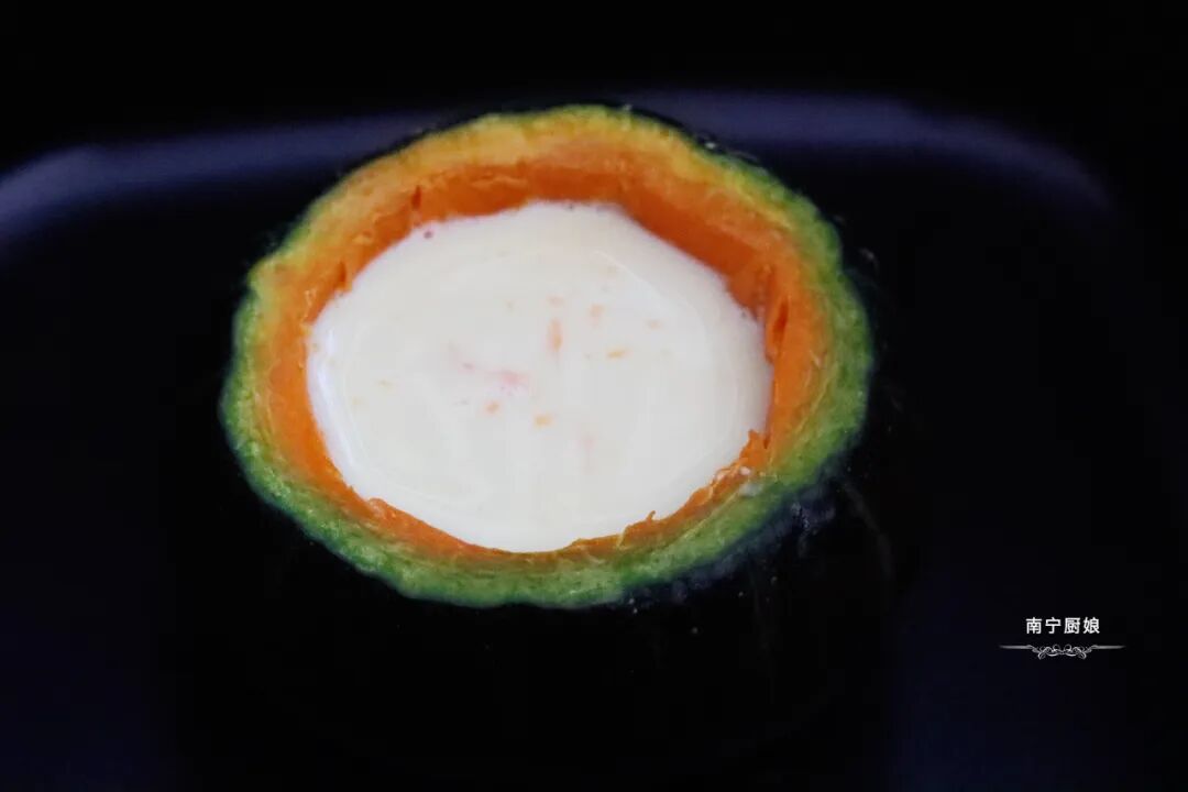 4、南瓜烤好之后,我们就可以把打好的鸡蛋和牛奶,倒进南瓜当中,在倒的时候大家不需要倒得很满,只需要与南瓜切口差不多齐平就可以了。