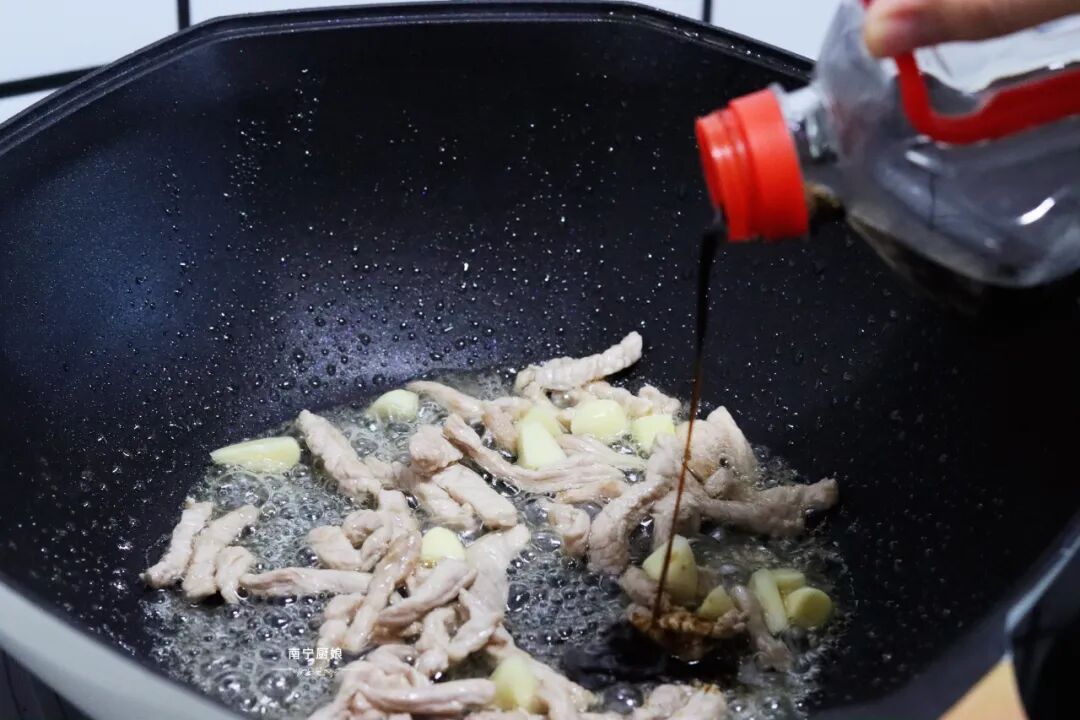 4、加入少量的生抽,给里脊肉润色增香,快速翻炒均匀。