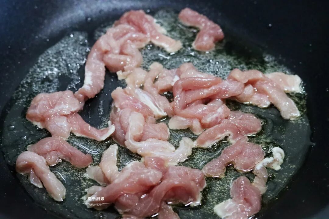 2、起锅,往锅里加入多一些的食用油,等油温升高之后,把切好的里脊肉放进锅里,快速翻炒。