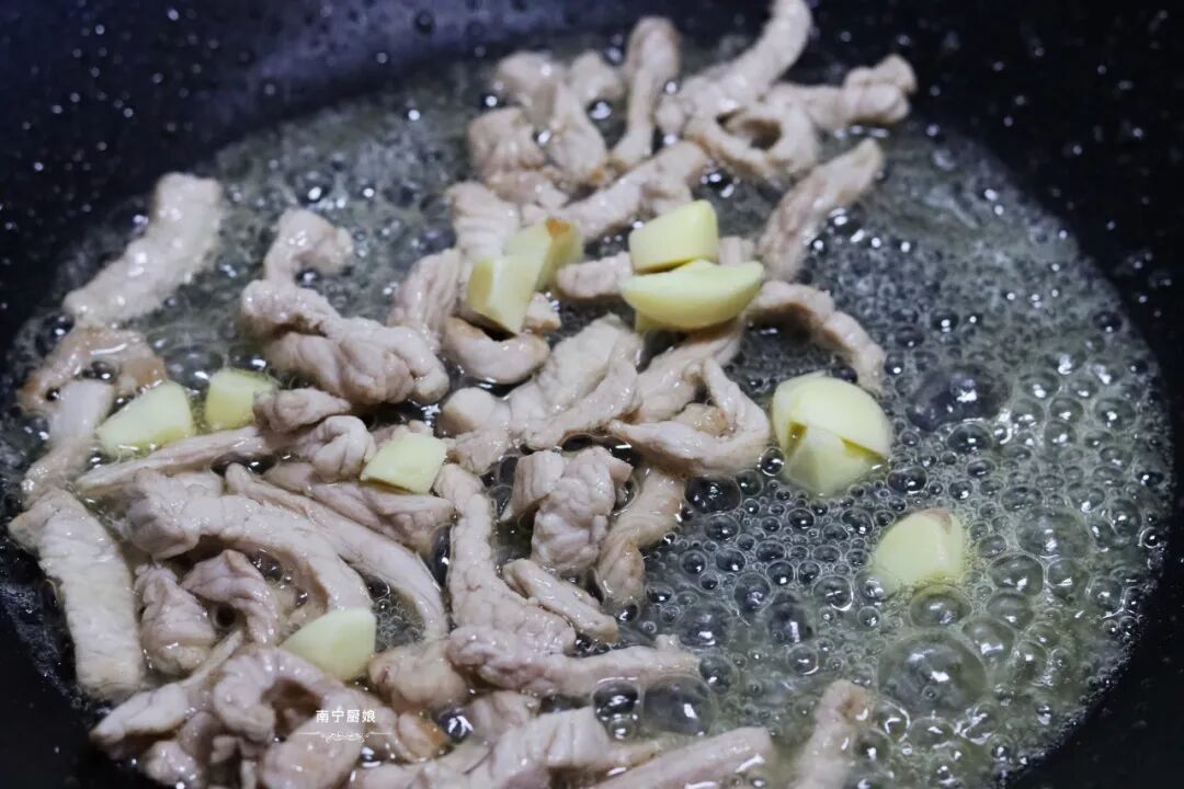 3、等里脊肉丝都变色之后,就可以加入切好的蒜粒,继续翻炒出香味。