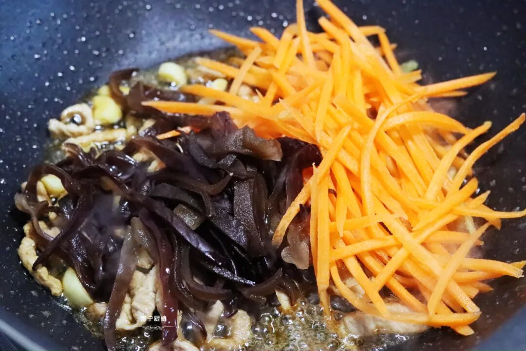5、等里脊肉飘出香味,就可以依次加入鲜木耳丝、胡萝卜丝,先快速翻炒,把鲜木耳丝和胡萝卜丝炒到7分熟,黑木耳和胡萝卜需要翻炒的时间是比较长的,这样才能保障这两种食材能够熟透,吃起来的时候才不会影响口感和健康哦!