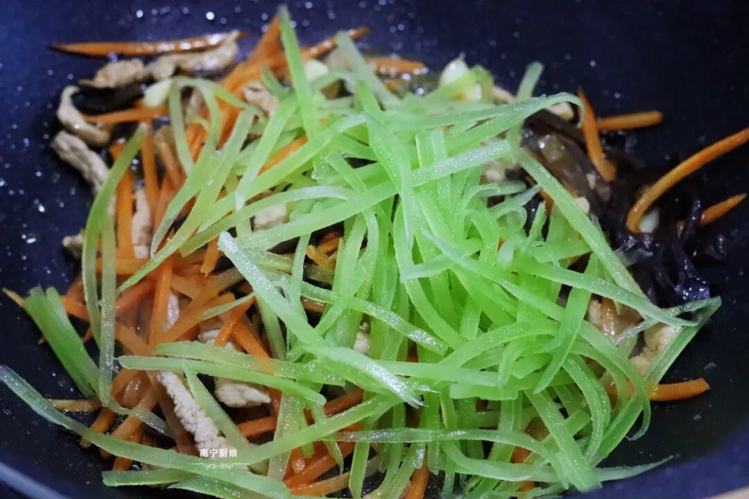 6、等黑木耳和胡萝卜丝都差不多之后,最后再加入莴笋丝以及大蒜,这两种食材熟透的时间比较短,按照这样的顺序,就可以保障每一个食材的口感及味道啦。