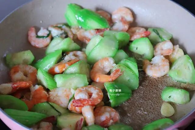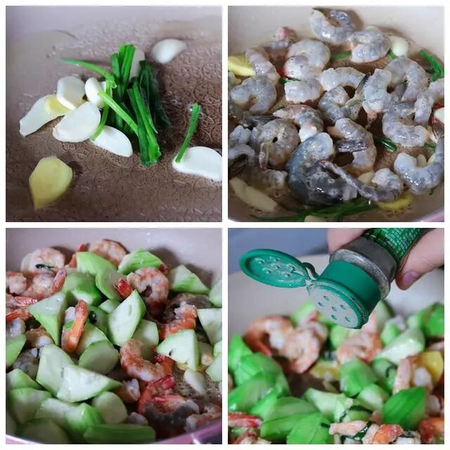 3、锅中热油,将葱姜蒜放进油锅中炒香,开始炒虾仁,虾仁微微变红时把丝瓜放进去,撒上一些白胡椒翻炒均匀。