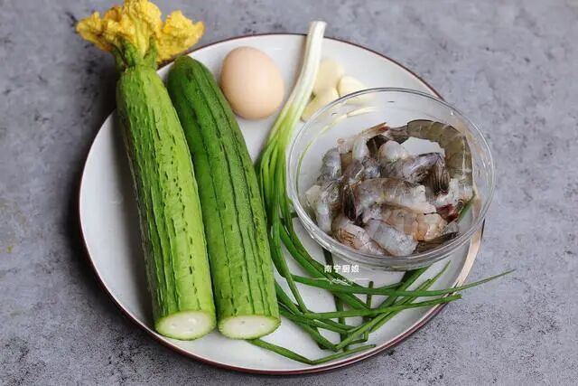 1根丝瓜,六只虾仁,1个鸡蛋,小葱1根,姜,蒜3粒,盐,淀粉,食用油,白胡椒粉。