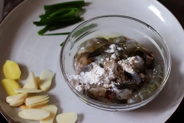 1、将虾仁清洗干净,在虾仁表面撒上适量盐,放入一个蛋清,放入干淀粉,放一点油,混合在一起之后腌制上十分钟左右。大蒜去皮后切片,生姜切片,香葱洗净切段装盘待用。