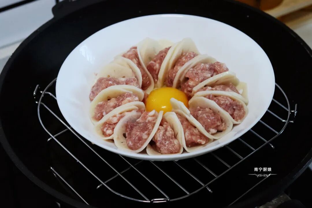 6、再起锅,往锅里加入适量的清水,然后放上蒸架,把摆放整齐的莲藕夹肉放在架子上,开大火蒸20分钟。