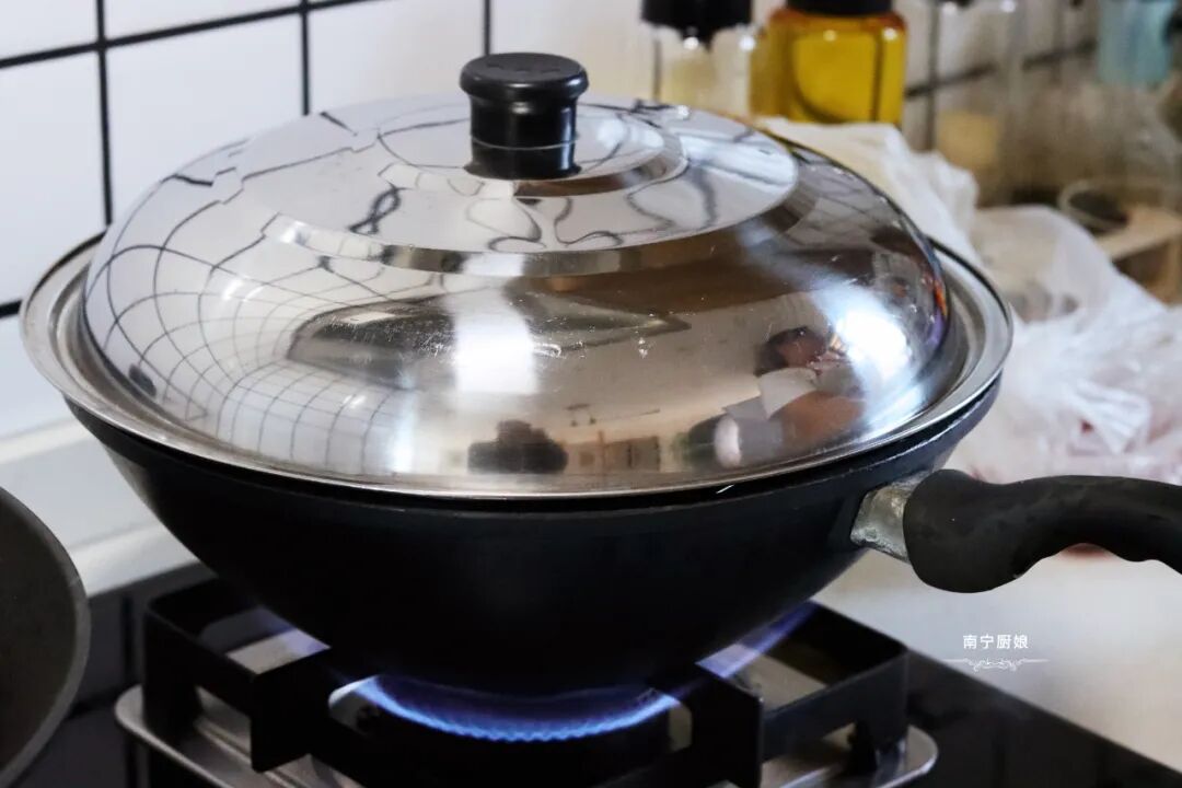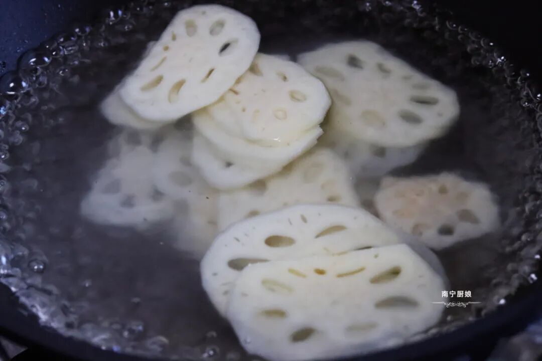 3、起锅,加入多一些的清水,等锅中微微沸腾的时候,就把莲藕片放进锅里进行焯水,莲藕片之所以容易变黑,是因为莲藕当中的淀粉含量高,长时间与空气接触就容易氧化变黑,我们先浸泡再焯水,就可以把莲藕当中的淀粉分解,那么莲藕后续就不会再容易变黑了。