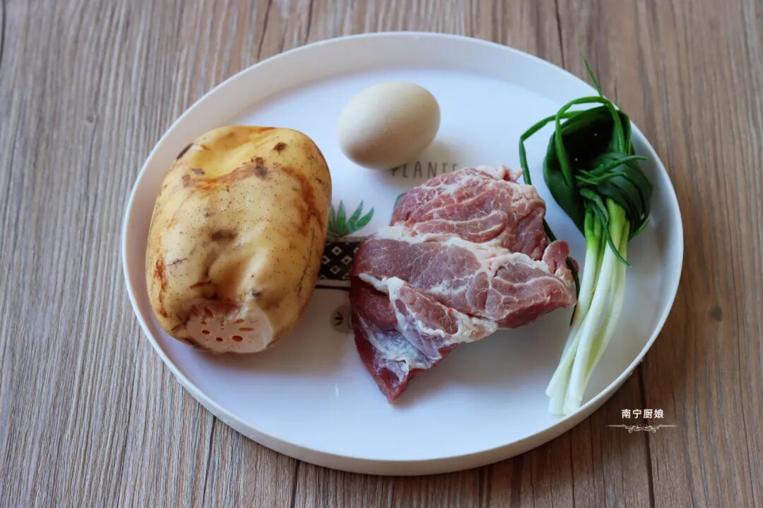 准备食材:莲藕1节,猪肉250克,青葱30克,鸡蛋1个。