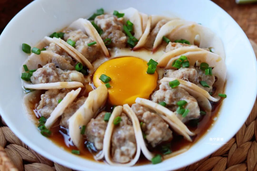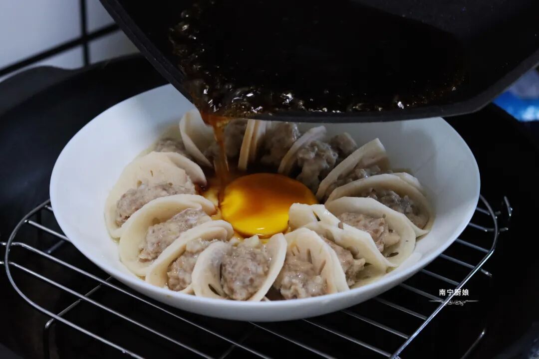 8、等莲藕蒸好之后,就可以把熬好的酱汁,淋在莲藕夹肉上,最后撒上少量的葱花点缀,就可以上桌享用啦!