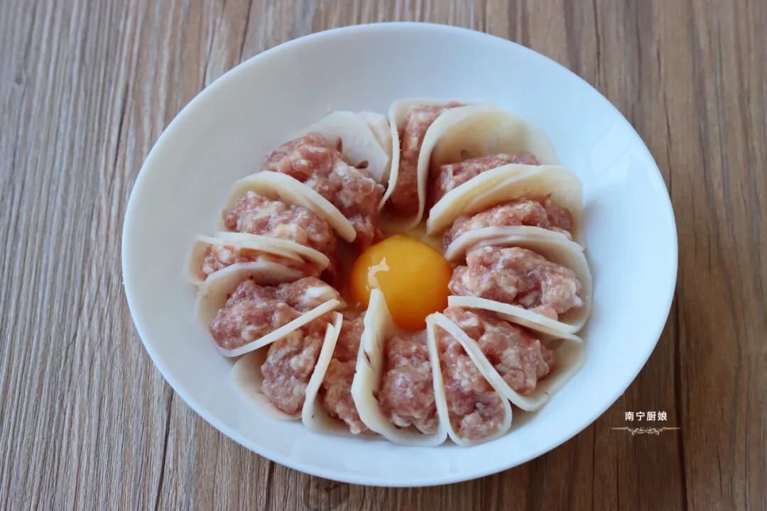 5、接下来把腌制好的猪肉,放在莲藕的中间,然后把莲藕片的两边收起来,依次整齐地摆放在一个碟子里,再把剩下的蛋黄,放在碟子的正中间。