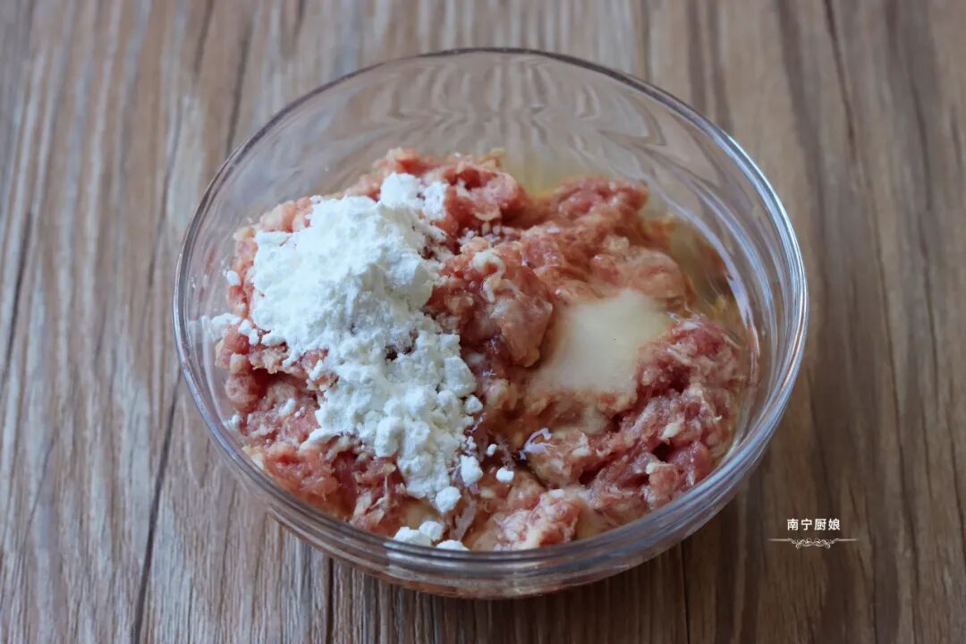 2、在猪肉沫里加入适量淀粉、鸡蛋清、食用盐、料酒,然后用手抓拌均匀,让猪肉沫都吸收所有的酱汁,用鸡蛋清来腌制猪肉沫,这类做法类似于调饺子馅,可以让猪肉沫更好的成团凝固,同时也可以起到嫩肉、去腥的作用,让猪肉吃起来更嫩滑,猪肉抓拌好之后,放一旁腌制10-20分钟。