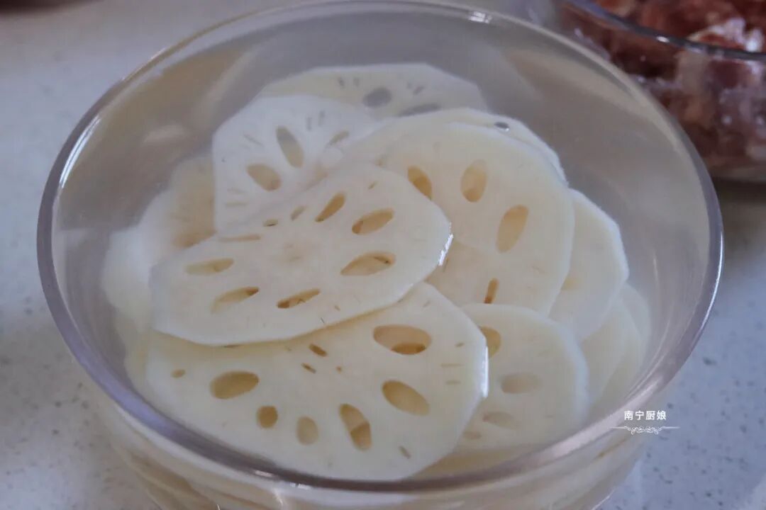 1、新鲜的莲藕买回家之后,去皮切成厚度在3毫米左右的莲藕片,放在一碗清水里,防止莲藕氧化变黑;猪肉清洗干净剁成肉沫;青葱切成葱段;鸡蛋打在碗里,但不要打散,保留好蛋黄,一起备用。