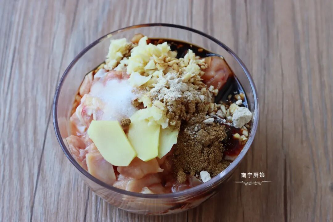 3、往切好的鸡腿肉当中放入适量的姜片、五香粉、胡椒粉以及打好的蒜泥,再加入少量的白糖和食用盐,之后再淋入生抽、料酒以及适量的蚝油,用手将碗内的调料和鸡肉全部一起抓拌均匀,让鸡肉能够充分的吸收酱汁腌制入味。