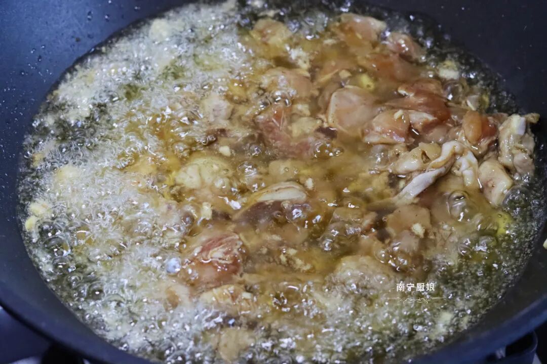 4、等鸡肉腌制10~15分钟之后,就可以起锅,往锅里加入多一些的食用油,等油温升高至6成热的时候,把腌制好的鸡肉下入锅中,高温油炸。