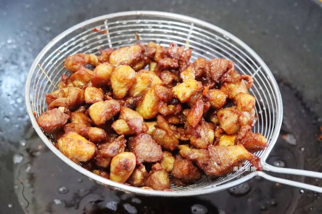 5、鸡腿肉炸至金黄,就可以用滤网捞出,这样炸出来的鸡腿肉会更香脆,吃起来就会是外酥里嫩的口感,所以制作这一道菜一定要记得先把鸡肉油炸一遍。