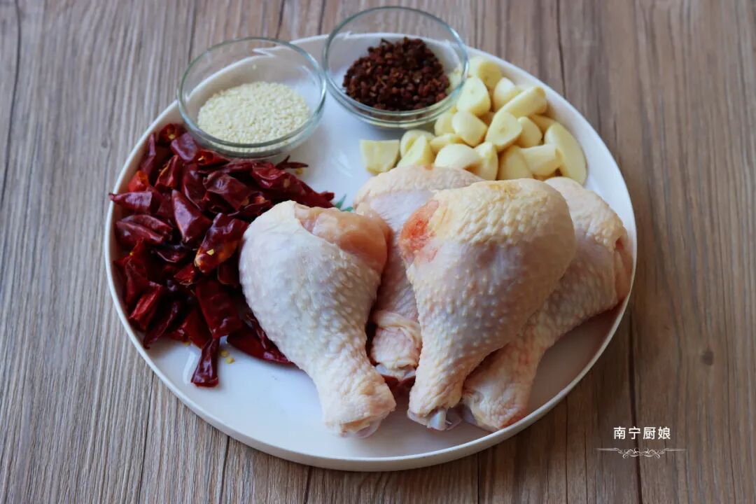 准备食材:鸡腿4个,干辣椒250克,蒜米100克,白芝麻30克,花椒30克。