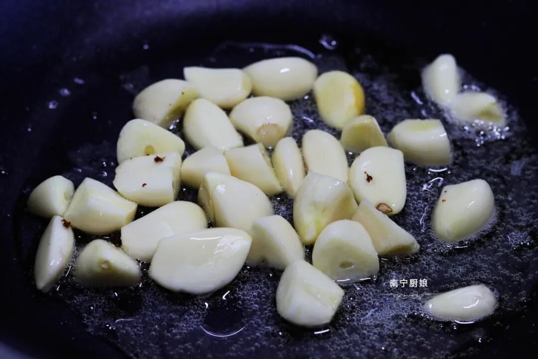 6、把锅里多余的油倒出来,只留少部分底油,然后开火把油温烧热,再把剩下的蒜米放入锅中炒出香味。