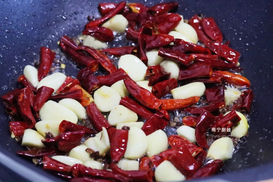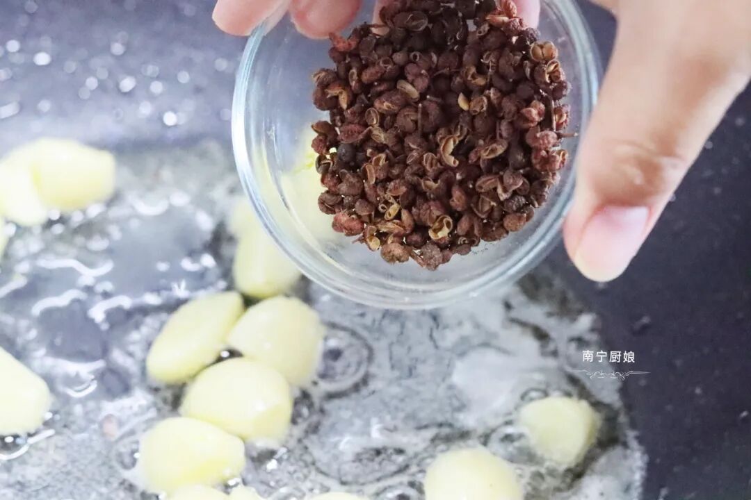 7、蒜米炒到微微金黄,就可以把花椒倒入锅中,一起快速翻炒,炒出花椒的香麻味。