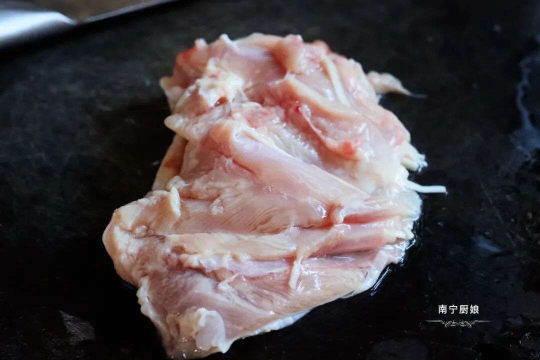 1、我们从市场上买回来新鲜的大鸡腿,然后用剪刀把鸡腿剪开,把鸡腿中间的骨头剔除出来,这样后续在吃的时候就会更方便,不会吃到鸡骨头了。