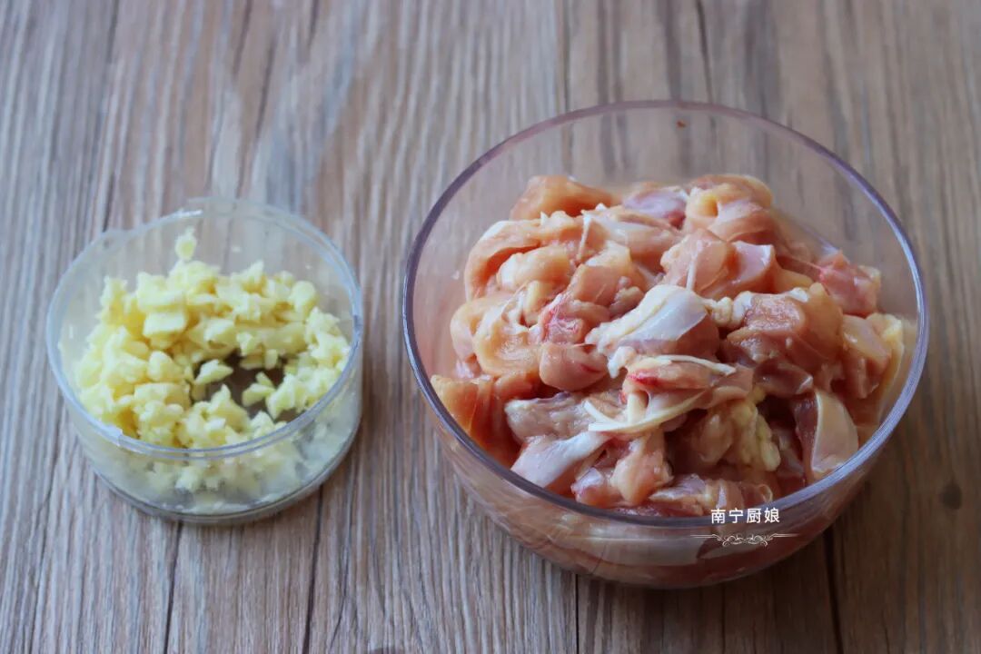 2、鸡肉都剔除好之后,就把鸡腿肉切成块状,放在一旁备用,蒜米取出三分之一,去好蒜衣然后放进蒜泥机里打成蒜泥。