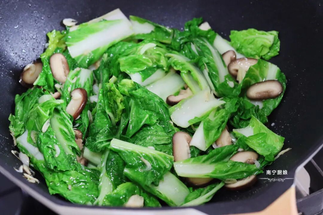 8、把所有的食材全部都翻炒入味之后,我们这一道鲜脆爽口的小白菜炒香菇就可以出锅啦。