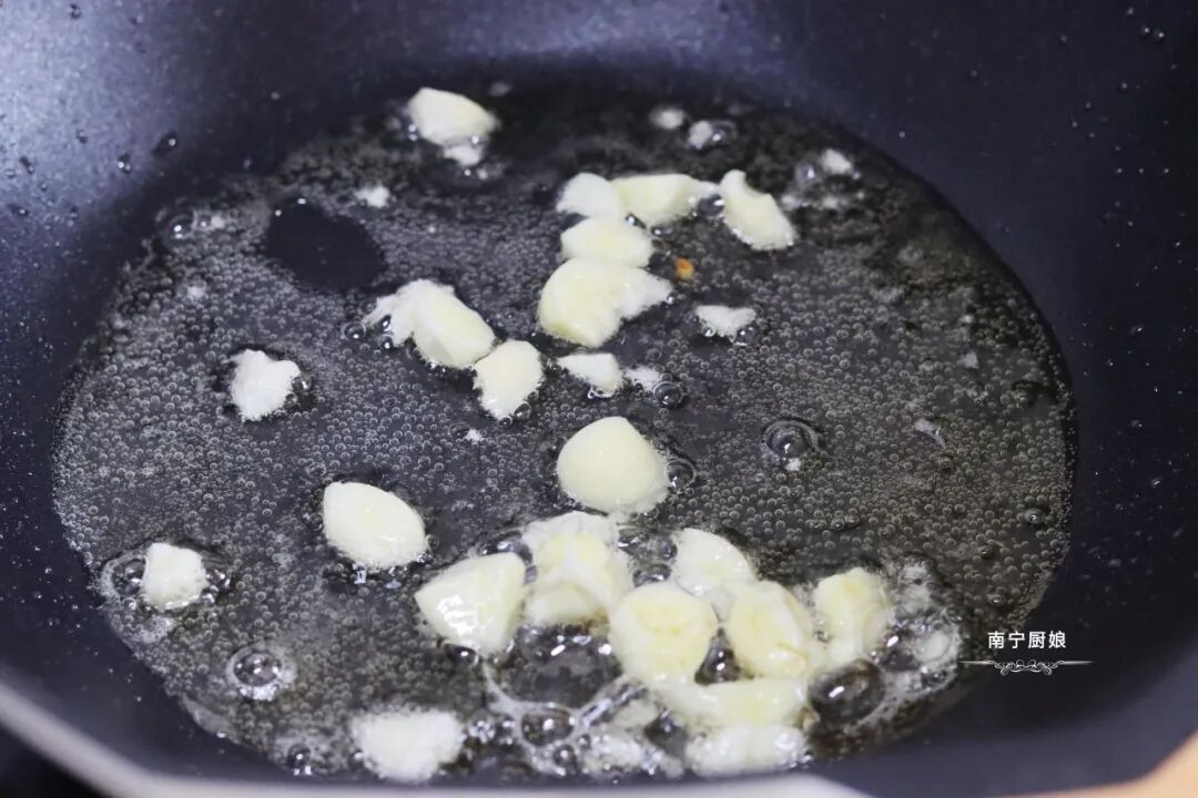 2、起锅往锅里加入多一些的食用油,等油温升高之后再加入切好的蒜瓣,爆炒出香味。