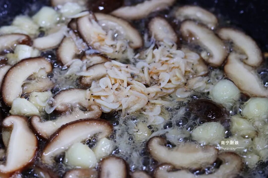 4、等香菇都逐步地变色之后,就可以往锅里加入清洗好的虾米,一起快速翻炒。