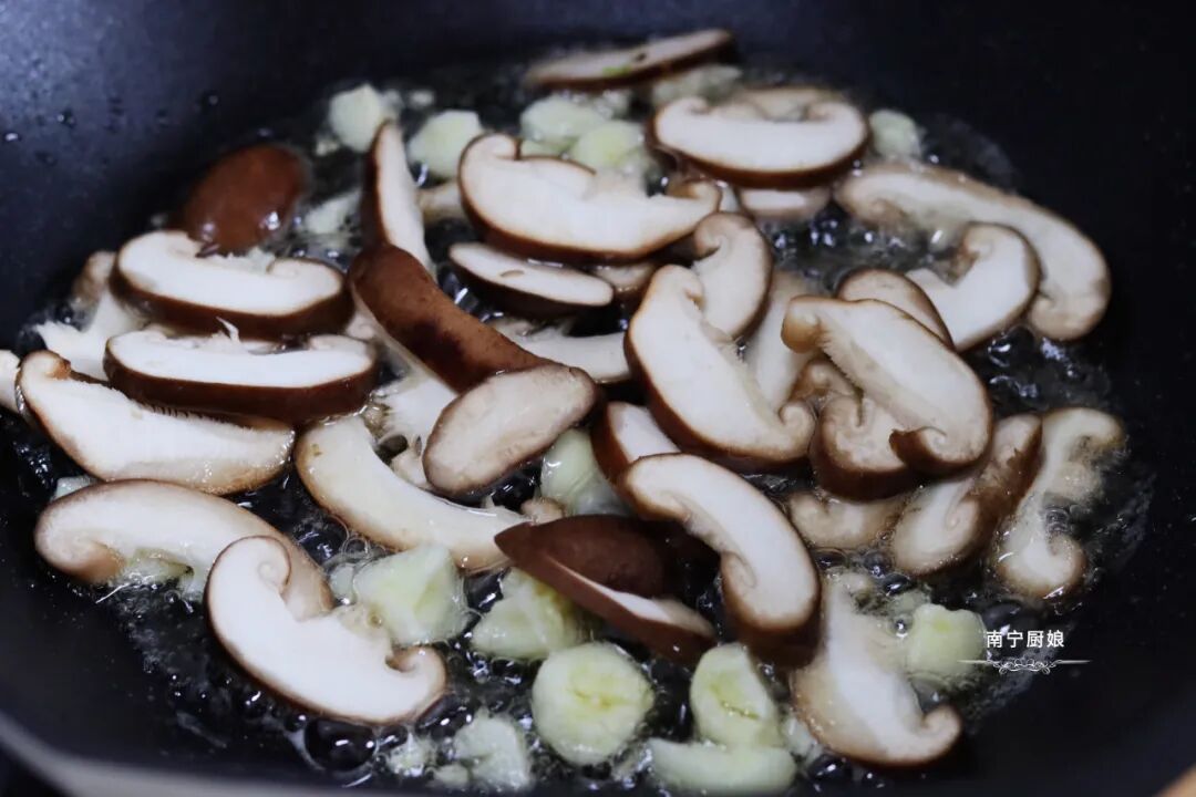 3、等锅中飘香就可以加入切好的香菇片,一起快速翻炒,炒出香菇的香味来。