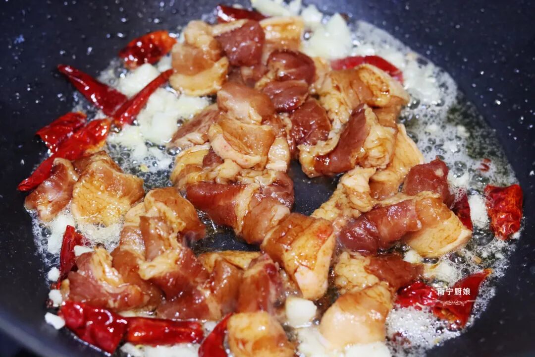 6、等香味都飘散出来,我们就可以加入腌制好的五花肉,进行快速地翻炒,大家注意在翻炒的过程当中要持续保持大火。