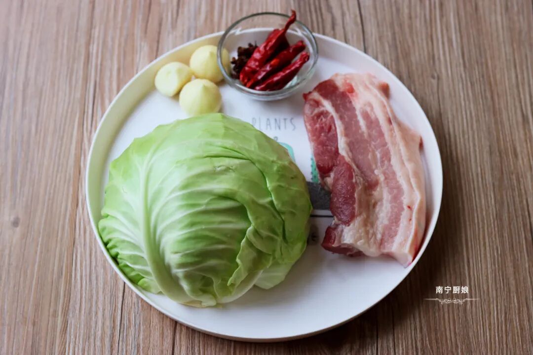 准备食材:包菜一颗,五花肉300克,干辣椒5粒,花椒20克,蒜米3颗。
