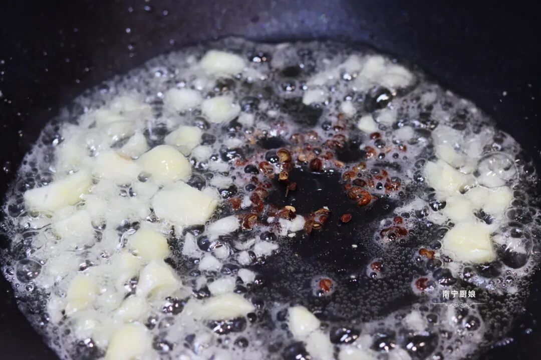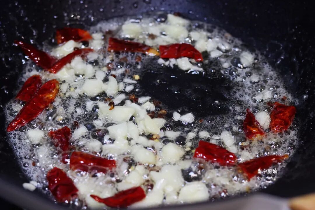 5、爆炒出蒜末的香味就可以依次加入花椒以及干辣椒,继续开大火爆炒出两种香料的香味。