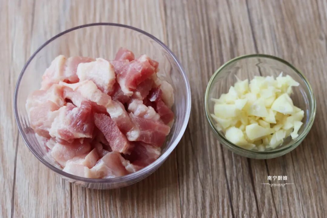 2、五花肉清洗干净之后切成片状,三颗蒜米,拍碎切成蒜末。