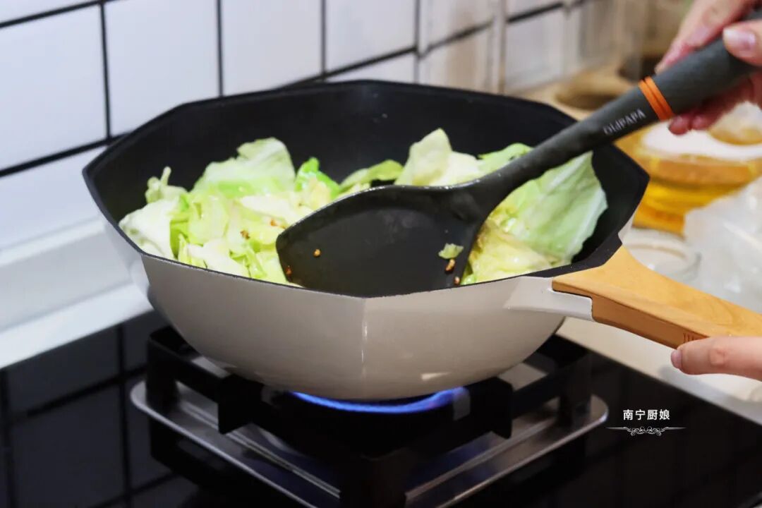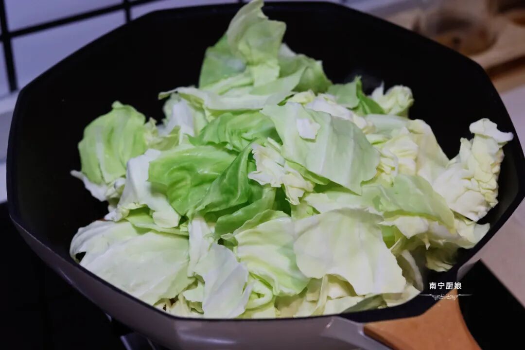 9、等包菜都变软并且到八分熟的时候,就可以转中火,开始着手调料。