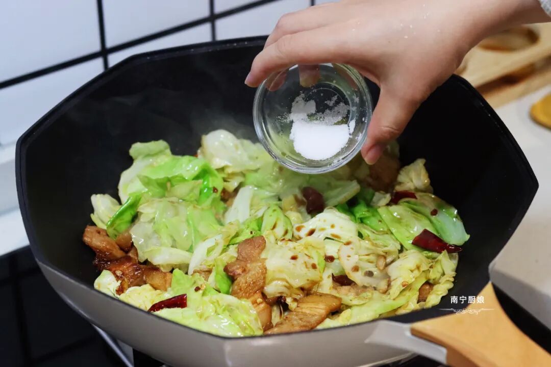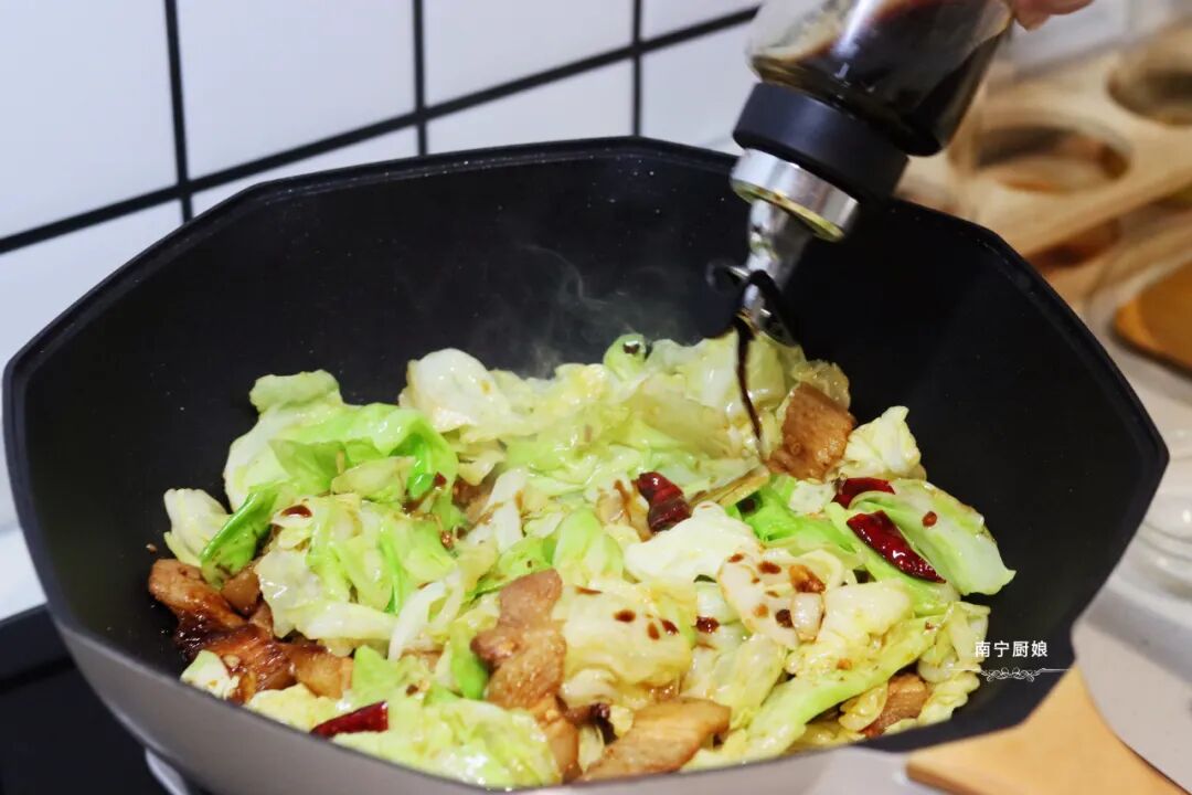 10、往锅里加入少量的生抽以及适量的食用盐,快速把锅内的食材搅拌均匀,让包菜和五花肉都均匀的吸收酱汁的味道。