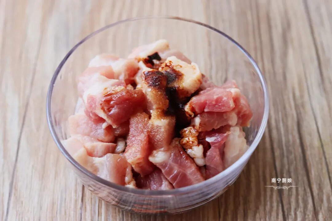 3、往切好的五花肉里,加入少量的生抽以及料酒还有蚝油,适量的食用盐,用手抓拌均匀,让五花肉都充分地吸收酱汁,以达到去腥增香的作用,然后放在一旁腌制10分钟。