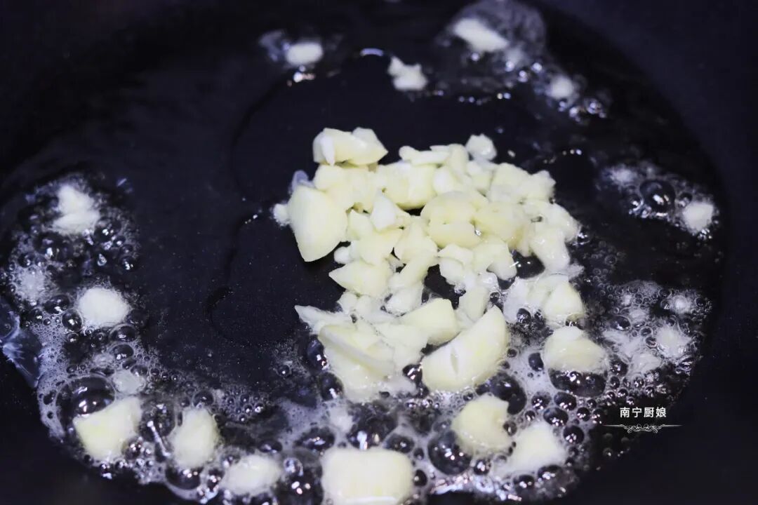 4、起锅往锅里加入多一些的食用油,等油温升高之后就可以加入切好的蒜末。