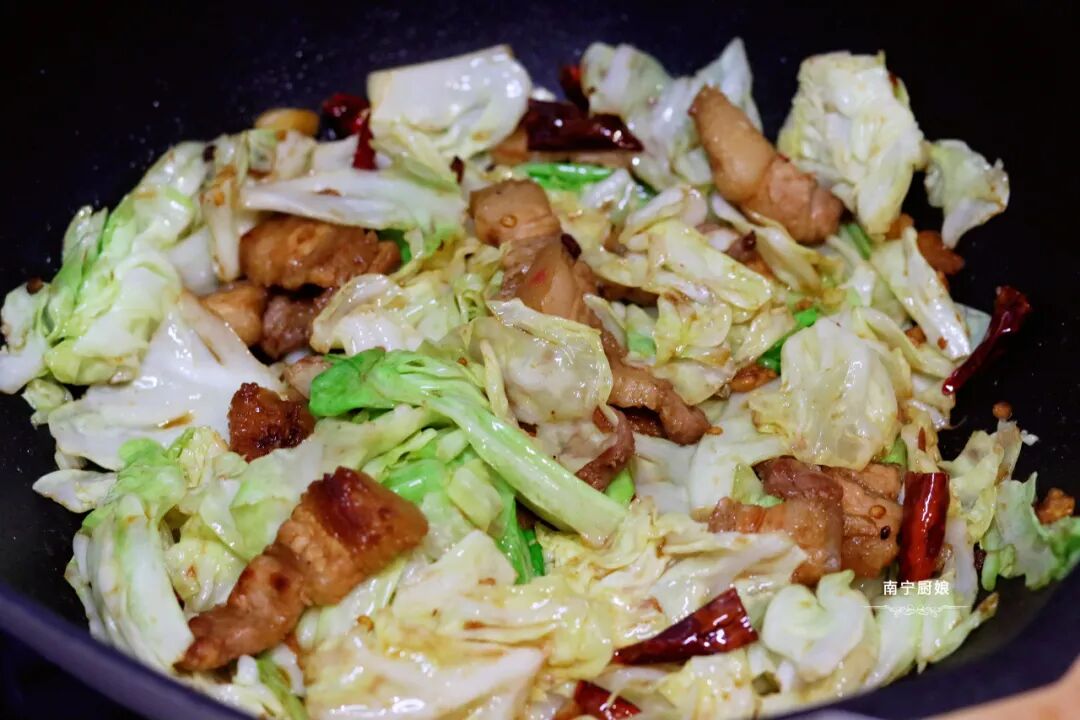8、加入撕好的包菜,进行快速的翻炒,在翻炒的过程当中,大家也要持续的保持大火,用大火翻炒可以让包菜当中的水分快速挥发,同时也可以激发出锅内所有食材的香味,这样炒出来的包菜在后续才不会出水,保持干燥。
