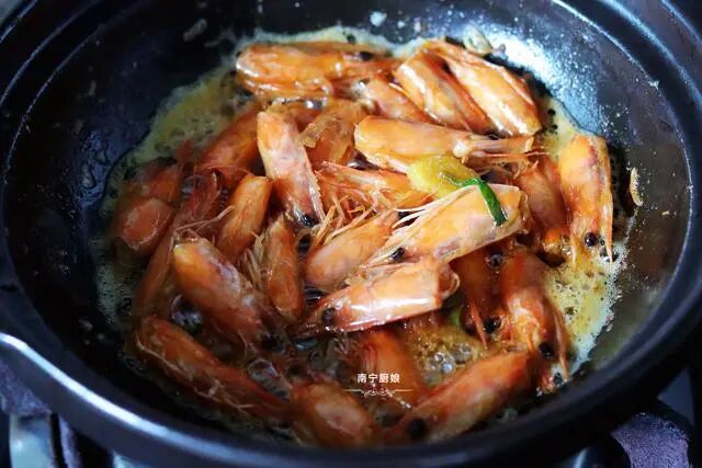 2、在砂锅中烧油,先将葱段和姜片放进锅中,炒香之后放虾头,翻炒出虾油。