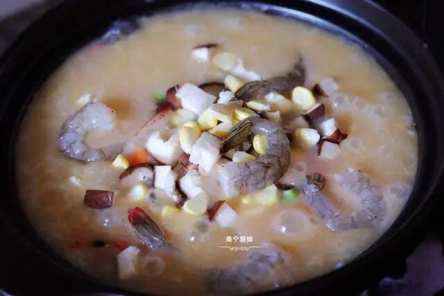 4、大米煮开花后把香菇,胡萝卜丁、玉米、豌豆放进锅中。把腌制好的虾仁也放进锅中,搅拌下,扣上锅盖焖煮大概十分钟的时间。