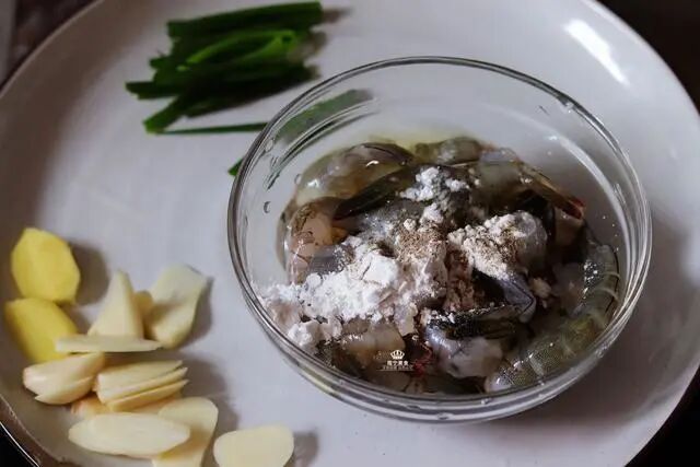 1、鲜虾洗净挑除虾线,掐掉虾头,不用去壳。虾头接下来还需要用哦。处理干净的虾仁上面撒上淀粉和白胡椒粉,兑上一点料酒,腌制十五分钟后即可制作。
