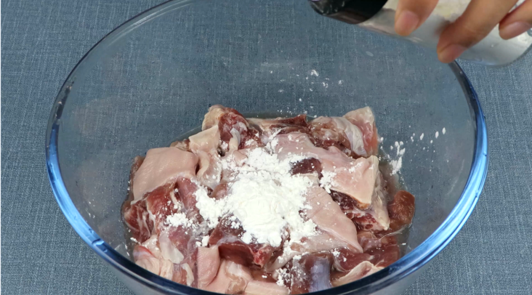 将水倒掉之后,往羊肉表面撒上面粉,然后再加入水,用手不断地揉搓羊肉。